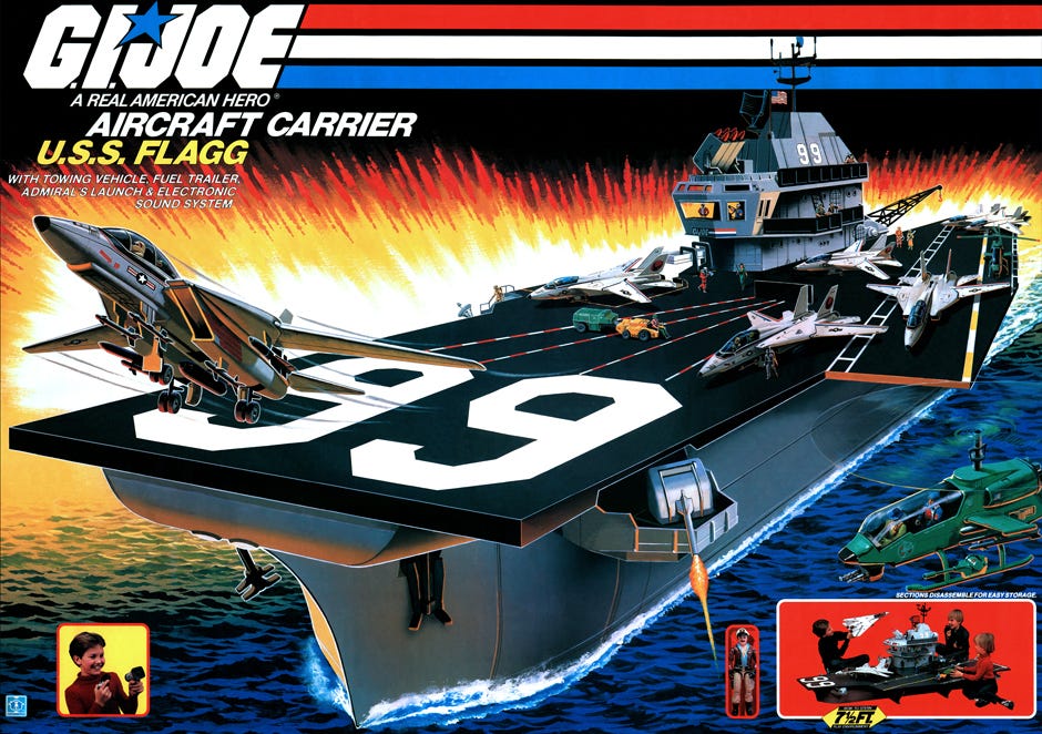 When we moved to the suburbs, my brothers and I kept building our collection. Each purchase had to be debated and negotiated since we pooled our resources. Commercials constantly dangled new characters and vehicles before us, not to mention temptations from other franchises like He-Man, ThunderCats, Transformers, and Star Wars. For most kids, it was a literal arms race to see who had the best collection. Toymakers competed too, constantly one upping each other. Then in 1985, Hasbro dropped what felt like the atomic bomb of toys, the U.S.S. Flagg aircraft carrier.